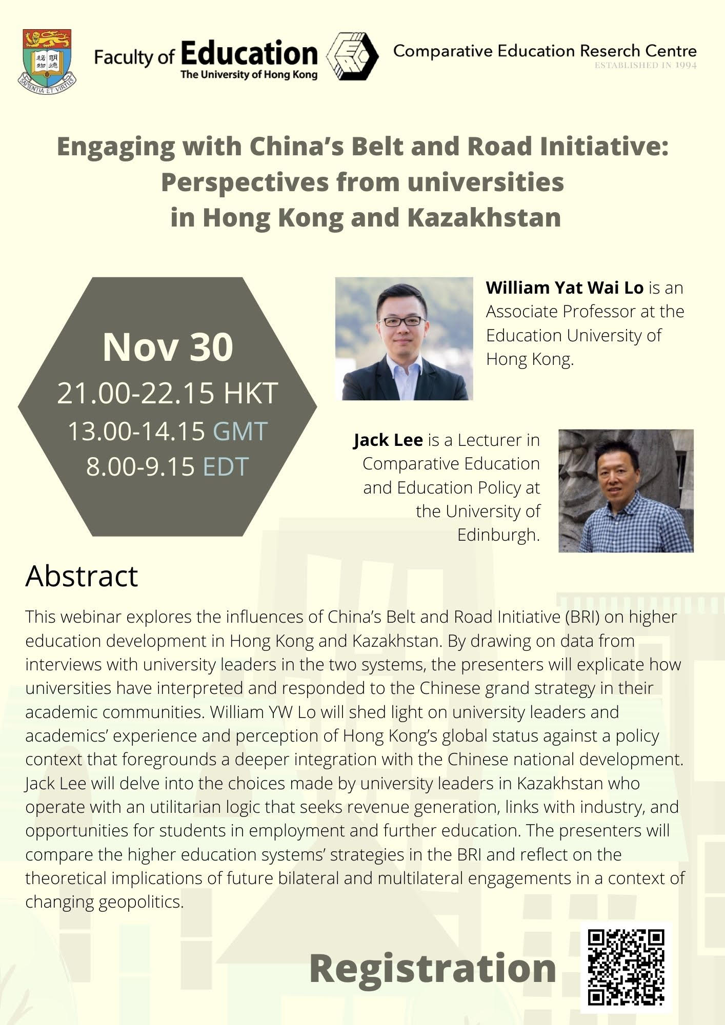 On November 30, 2021 (9pm HKT), please join us for a webinar at Comparative Education Research Centre hosting William Yat Wai Lo, Education University of Hong Kong and Jack Lee, University of Edinburgh, who will share and compare their most recent findings on Kazakhstan’s and Hong Kong’s academic engagement with China’s Belt and Road Initiative.